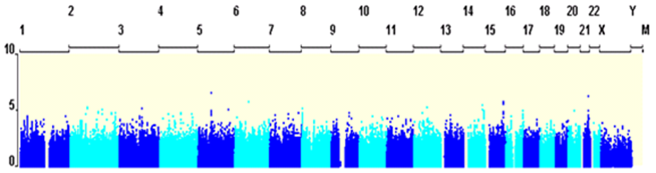 X-axis represents the chromosomal location for each SNP, and y-axis the −log10 p-value of the association signal.