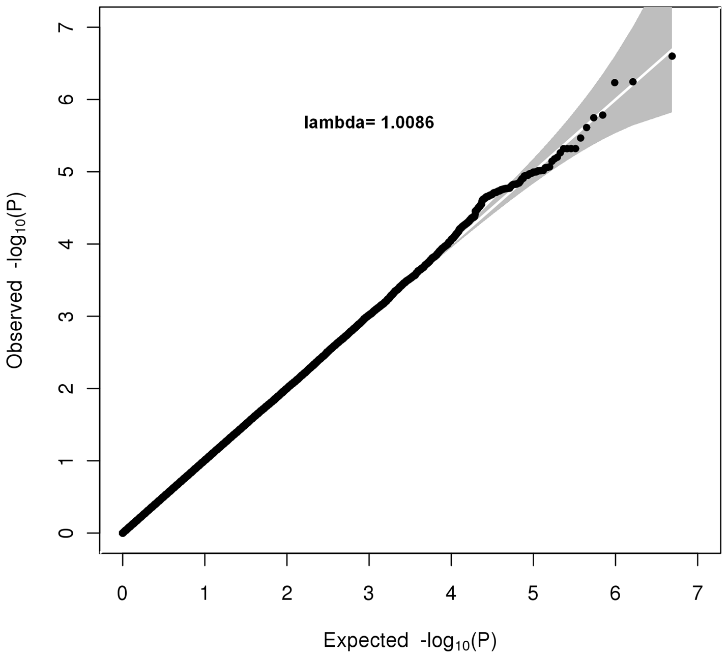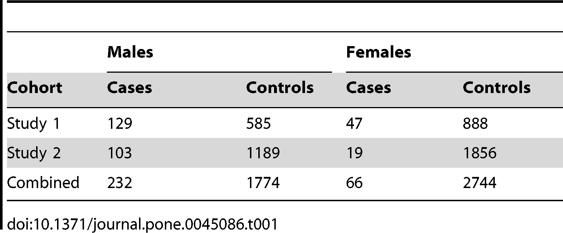 An approximate power calculation [28] indicates that the combined sample provided 50%, 72% and 87% power to detect a genetic variant (with a minor allele frequency of 0.25) with a relative risk of 1.4, 1.5 and 1.6, respectively.