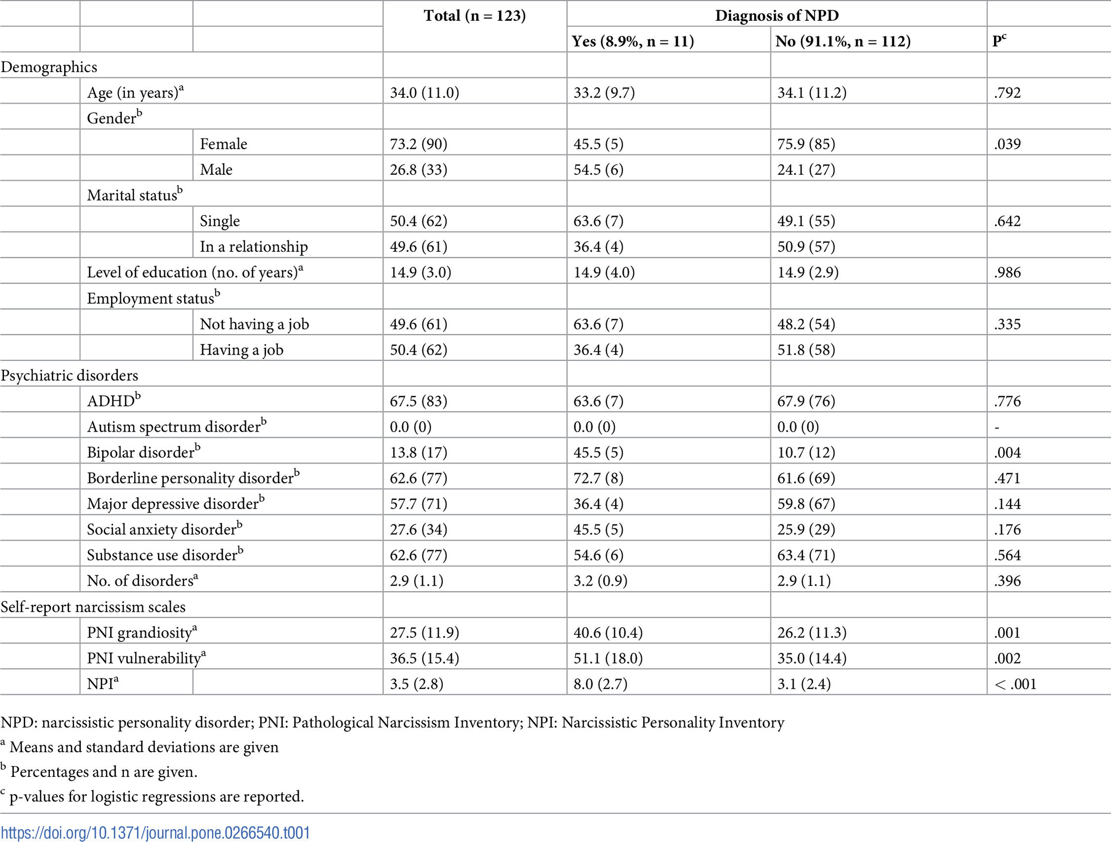 A total of 264 patients were referred to the center between October 2019 and January 2021. Five (1.9%) patients refused to sign the informed consent and 136 (51.5%) did not complete the NPI and/or PNI and/or were not assessed for NPD. Thus, a total of 123 (47.5%) patients were included in the study. There were no significant sociodemographic and clinical differences between these 123 participants and 136 participants who did not complete narcissism-related measures or were not assessed for NPD.