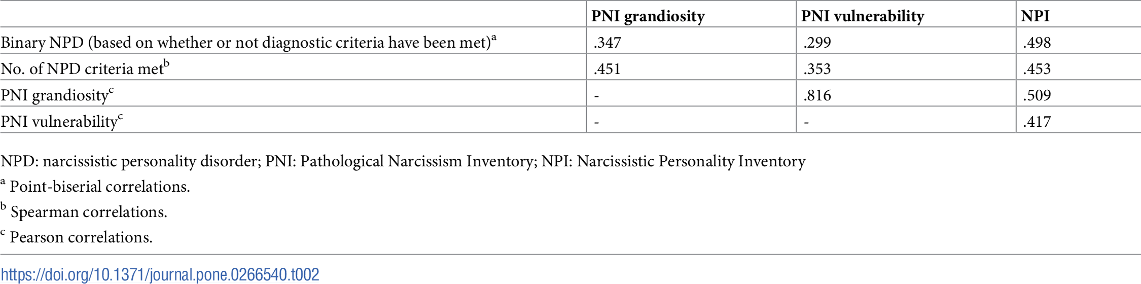 Our main finding is that the PNI and NPI were moderately associated with a measure of NPD, with the correlations ranging between .299 and .498 and therefore indicating a maximum of 24.8% of shared variance. This is in line with the results of another study making similar comparisons between self-report scales and clinician-rated measures of personality pathology [28].