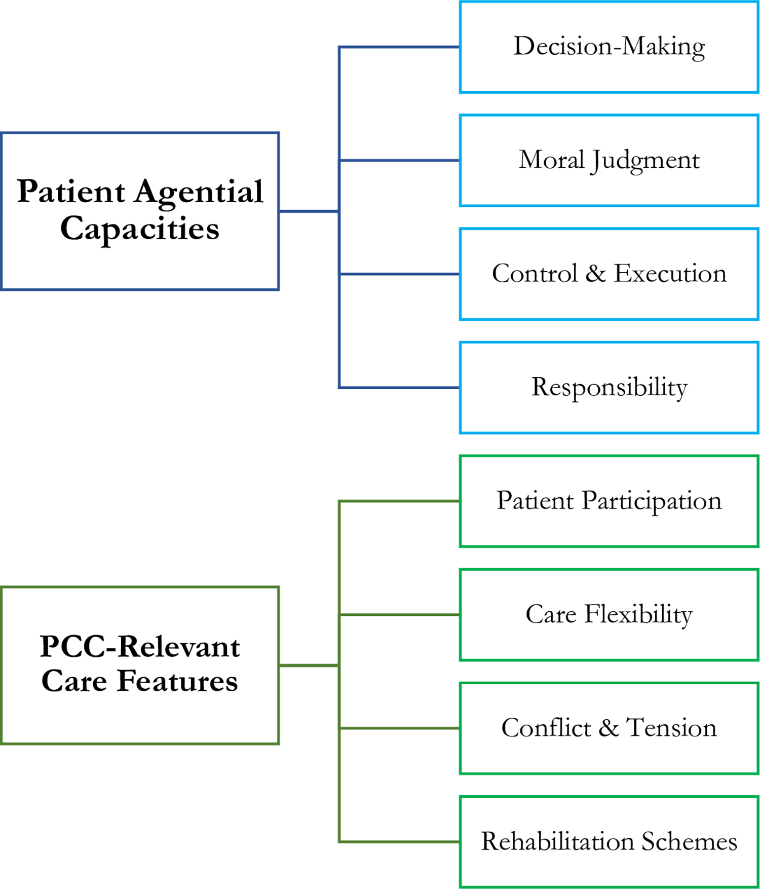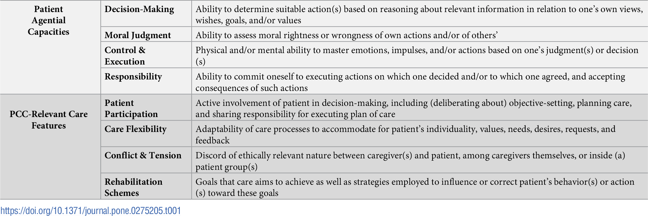 The selected categories of patient capacities (decision-making, control, moral judgments, responsibility) and PCC features (patient participation, care flexibility, conflicts, and rehabilitation strategies) were sketched in a tree diagram (Fig 1) and predefined (Table 1) to help produce the interview guide. Since the aim of this study was to elicit considered views and patterns of reasoning, rather than phenomenological lived experience, the interviews also contained elements of stimulating the subjects to explain, justify, and develop their views (see S1 and S2 Appendices).