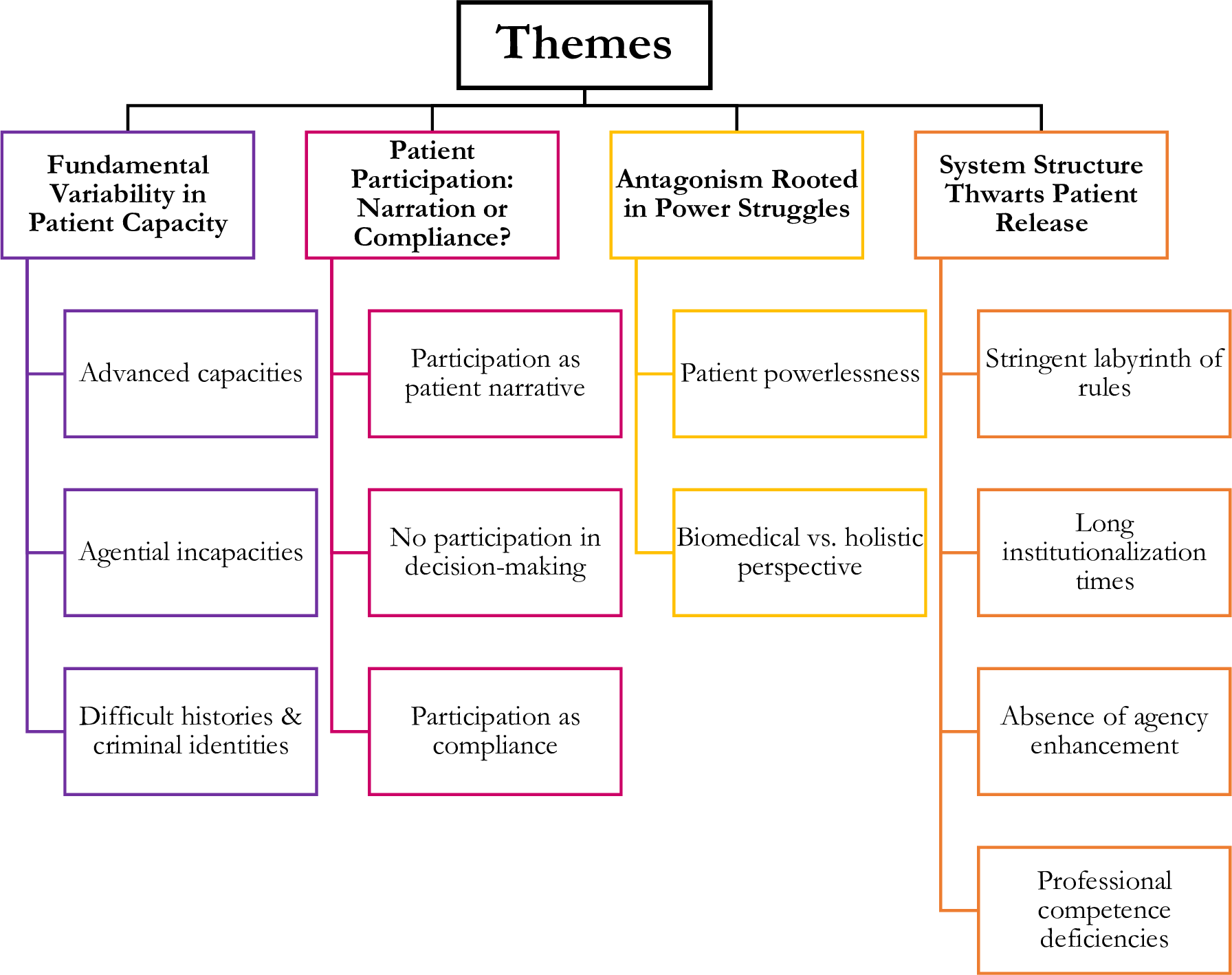 Four complex themes emerged from the data “Fundamental Variability in Patient Capacity”, “Patient Participation: Narration or Compliance?”, “Antagonism Rooted in Power Struggles”, and “System Structure Thwarts Patient Release”. Each theme included two to four subthemes (please see Fig 2).