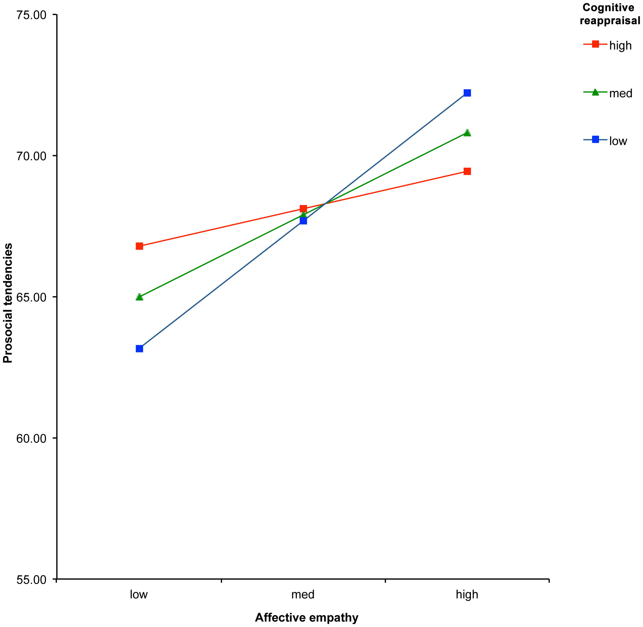 The type of emotion regulation strategy was important for moderating associations between empathy and prosocial tendencies; cognitive reappraisal moderated associations between affective empathy and prosocial behaviour whilst expression suppression did not. In addition, the degree of emotion regulation interacted with the degree of empathy to predict prosocial behaviour. Affective empathy was positively associated with prosocial behaviour for participants at low and average levels of cognitive reappraisal. This positive association was not evident in participants who reported a high tendency to reappraise. Instead, these individuals had similar levels of prosocial tendencies regardless of level of affective empathy.
