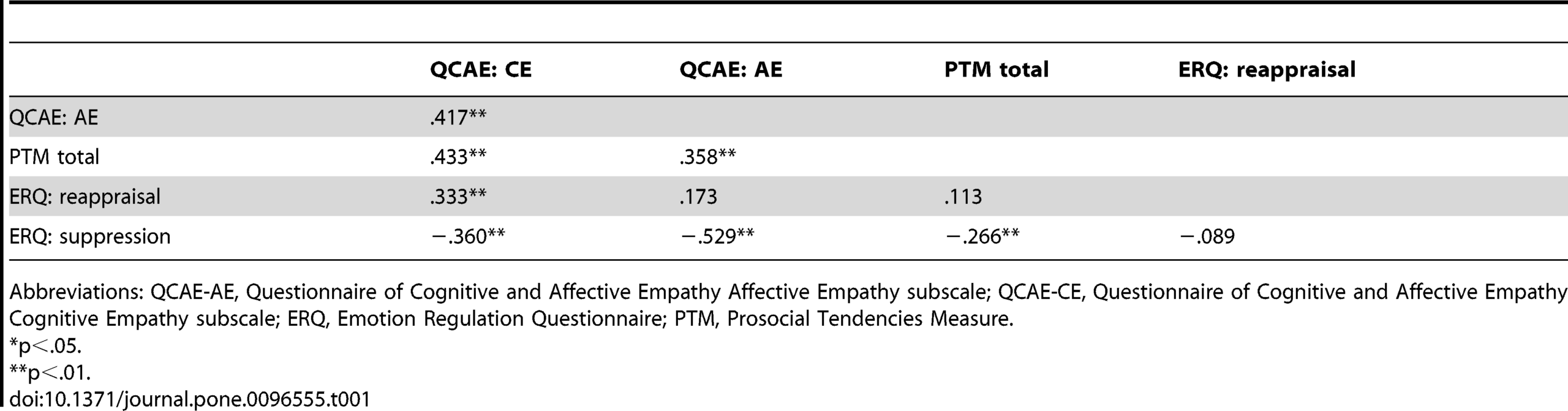 Bivariate correlations were corrected for multiple comparisons using Benjamini & Hochberg False Discovery Rate [32]. Corrected p-values are reported. Steiger’s Z tests (two-tailed) were conducted to test if the different types of empathy (i.e. affective and cognitive empathy) and the different types of emotion regulation strategies (i.e. cognitive reappraisal and expressive suppression) presented differential correlation coefficients with prosocial tendencies.
