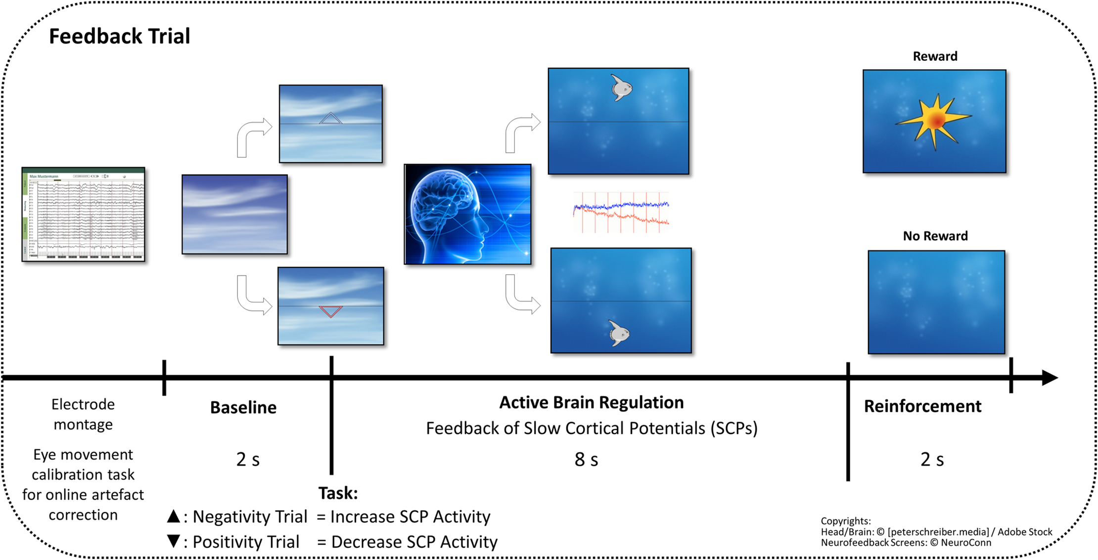 All participants underwent 25 EEG-based Slow Cortical Potentials (SCP) neurofeedback training sessions. SCPs were recorded at fronto-central regions and fed back to the patients’ monitor matched to preferences of the participants (e.g. fish, moon etc.). At the beginning of each trial, a triangle was displayed, specifying the polarity of the requested SCP shift of the upcoming regulation trial: a triangle pointing upwards required negative SCP shifts (increase of cortical activation), while a triangle downwards indicated required positive SCP shifts (inhibition of cortical activation). In the active regulation phase, the current SCP-activity was displayed as an object (e.g. a fish or a moon) at the participant’s screen in real time and moved accordingly to the participants brain activity upwards (indicating an increase in cortical activation) or downwards (indicating a decrease in cortical activation). The participants were required to learn how to volitionally move the object up- or down by controlling their SCPs in the required polarity. No specific strategy was suggested; subjects were instructed to develop their individual strategy to move the objects. The neurofeedback instruction emphasized that muscular (i.e. tension-relaxation) or respiratory strategies disturb self-regulation performance. Successful changes in cortical activity were rewarded with the symbol of a sun after each trial, as depicted in Fig 1.