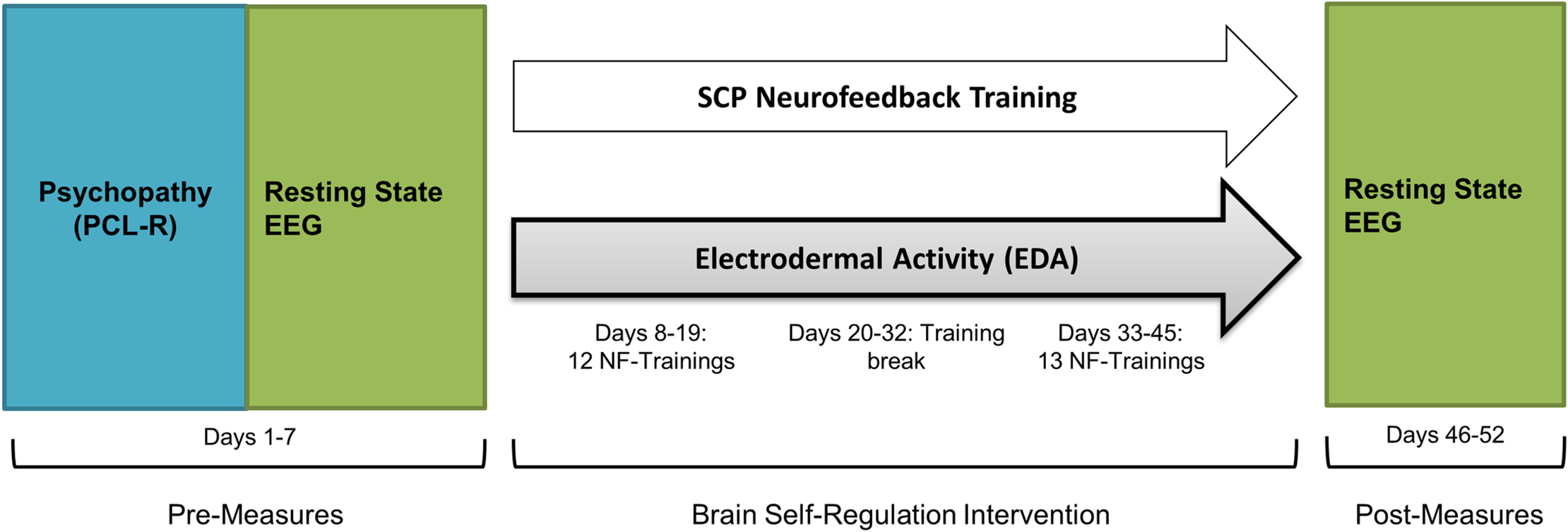 Initial clinical assessment: psychopathy (blue); Pre-/Post-measures: resting state EEG (green); Intervention: SCP-neurofeedback training; Measures during intervention: (a) Cortical measure: SCP activation (white), (b) Peripheral-physiological measures: Electrodermal activity (grey). SCP training consisted of 25 training sessions, each split into three training blocks with different conditions (feedback–transfer–feedback) and tasks (negativity–positivity) of 8 minutes per block.