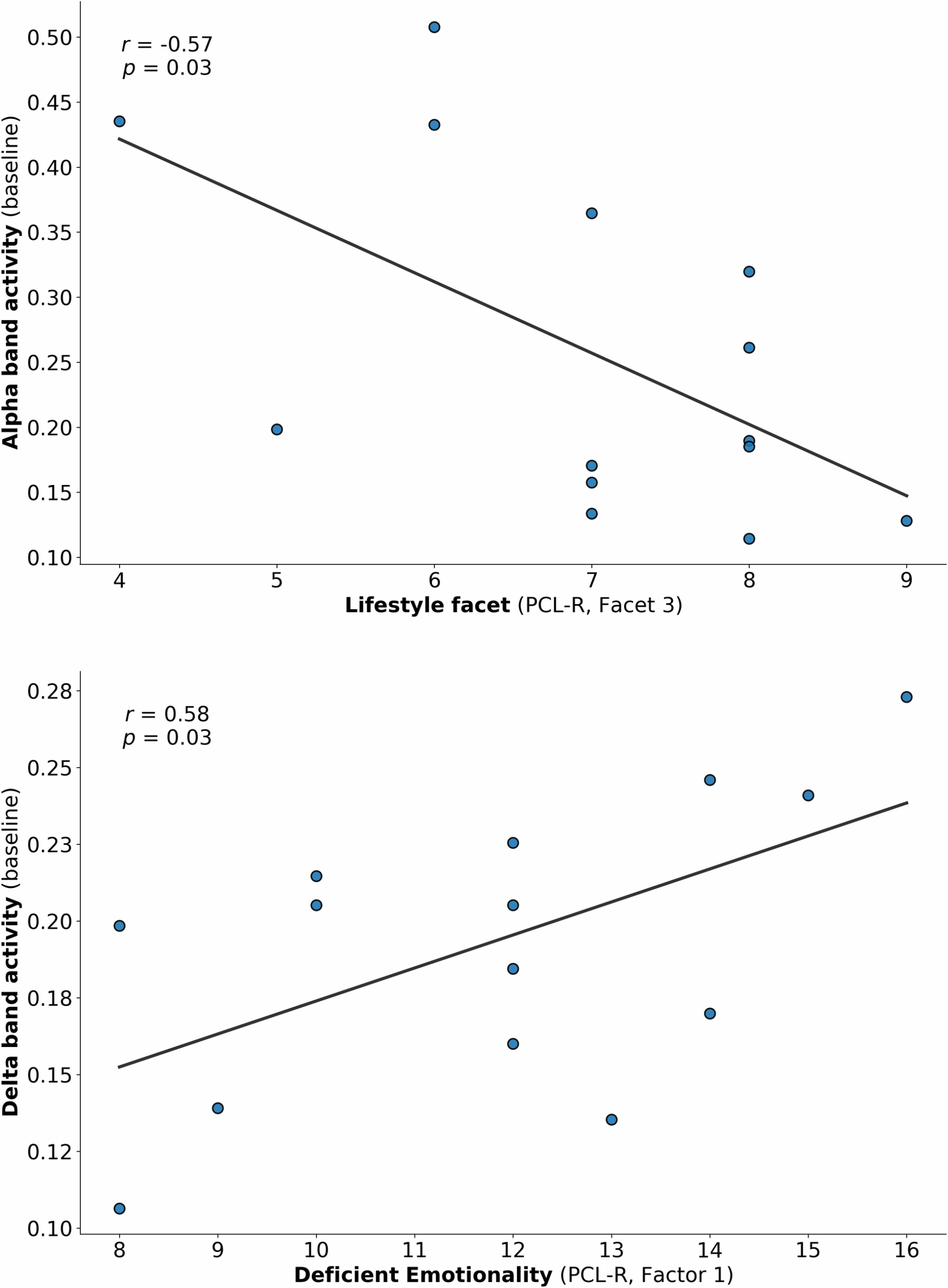 Still, it is unclear whether this underarousal should be interpreted as a consequence of specific brain abnormalities or due to the effects of chronic underarousal related to incarcerated samples, for instance, in forensic institutions or a general cortical underarousal, that is, irregular brain development / maturity. In contrast to Calzada Reyes and colleagues [15], we found that reduced alpha power at baseline was not related to higher scores on the Affective Facet of the PCL-R, but rather to higher scores in the Lifestyle Facet of the PCL-R. This could be explained by EEG findings of individuals in the ‘impulsivity spectrum’. The latter includes a wide range of disorders, not only antisocial, psychopathic personality and conduct disorders, but also substance dependencies, pyromania, pathological gambling and other disinhibitory disorders [69]. Since low alpha band activity is a consistently reported biomarker in these externalizing disorders [70, 71], it fits to our finding of an attenuated alpha band at baseline as being related to the Lifestyle Facet of the PCL-R, which contains items such as need for stimulation, lack of realistic long-term goals, irresponsibility and impulsivity.