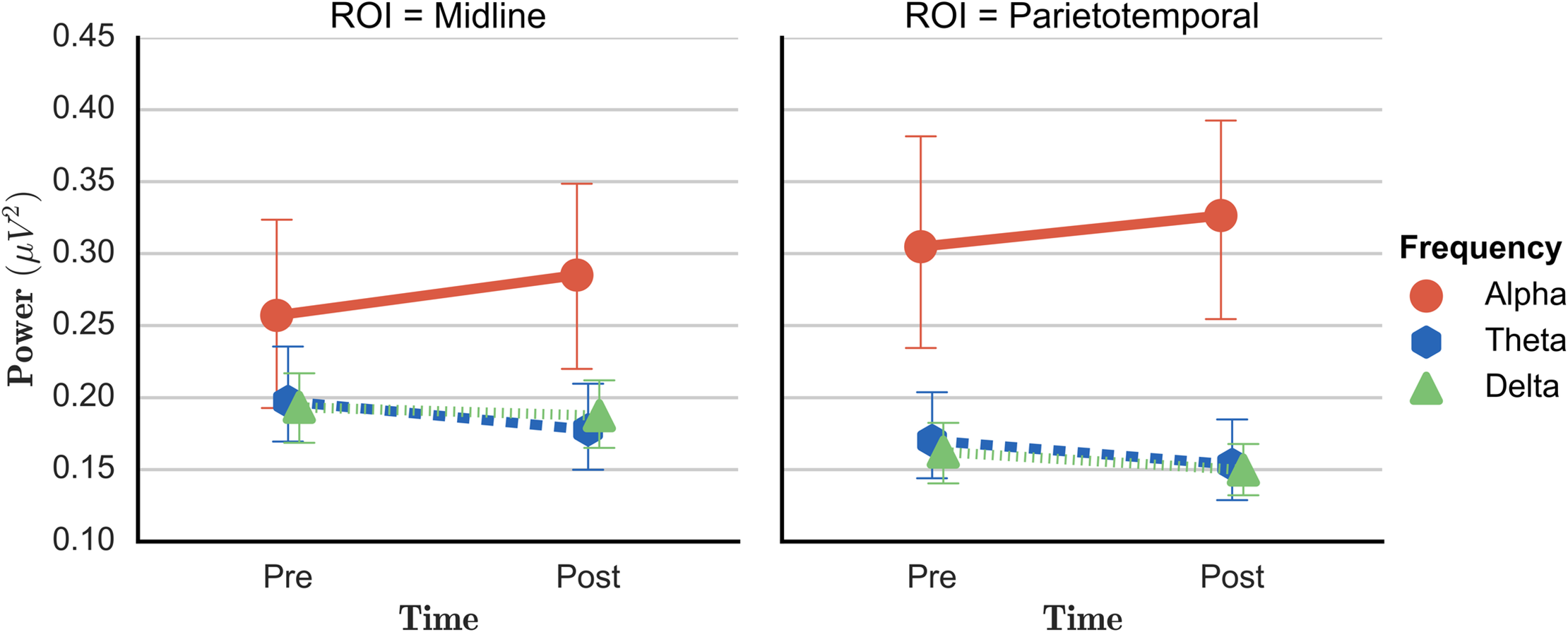 ab. Changes in resting state EEG before and after SCP neurofeedback at midline regions (5a: left) and parietotemporal regions (5b: right) during the eyes-closed condition. The y-axis values are the fraction of the total EEG power. Red line: Increase in alpha frequency band power from before to after SCP neurofeedback training. Decreases from before to after SCP neurofeedback training in delta frequency band (blue line) and theta frequency band power (green line). Vertical lines represent the standard error.