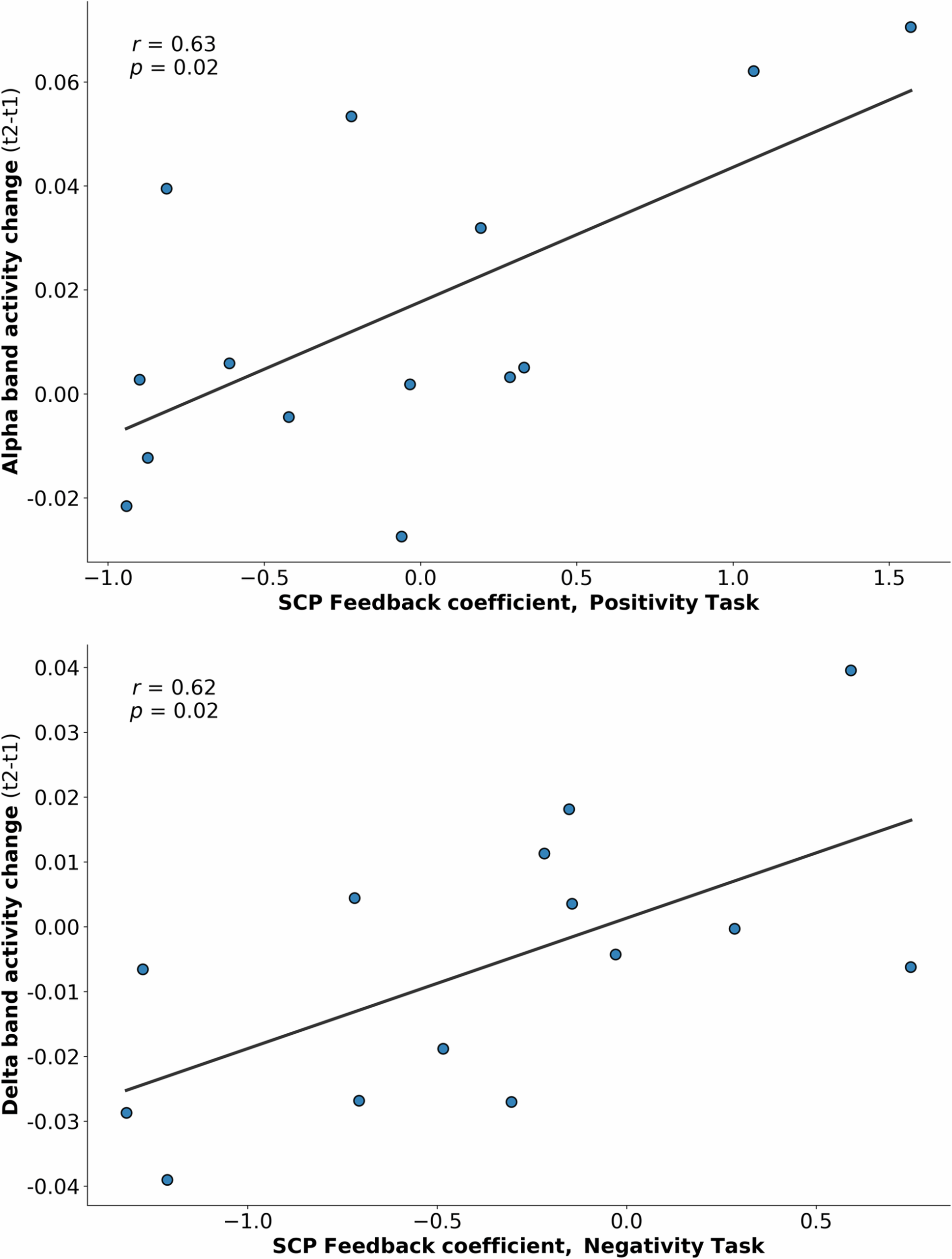 (a) Correlation between the increase of alpha band activity and the increase of the volitional production of electrical positive SCP shifts in neurofeedback training. Each dot represents one participant. [X-axis: The higher the positive number, the higher the increase in SCP feedback coefficient in positivity task over time; Y-axis: The higher the positive number, the more increase in alpha band from before to after SCP neurofeedback training]. (b) Correlation between the decrease of delta band activity and the increase of the volitional production of electrical negative SCP shifts in neurofeedback training. Each dot represents one participant. [X-axis: The higher the negative number, the higher the increase in SCP feedback coefficient in negativity task over time; Y-axis: The higher the negative number, the more reduction in delta band from before to after SCP neurofeedback training, i.e. negative values toward right].