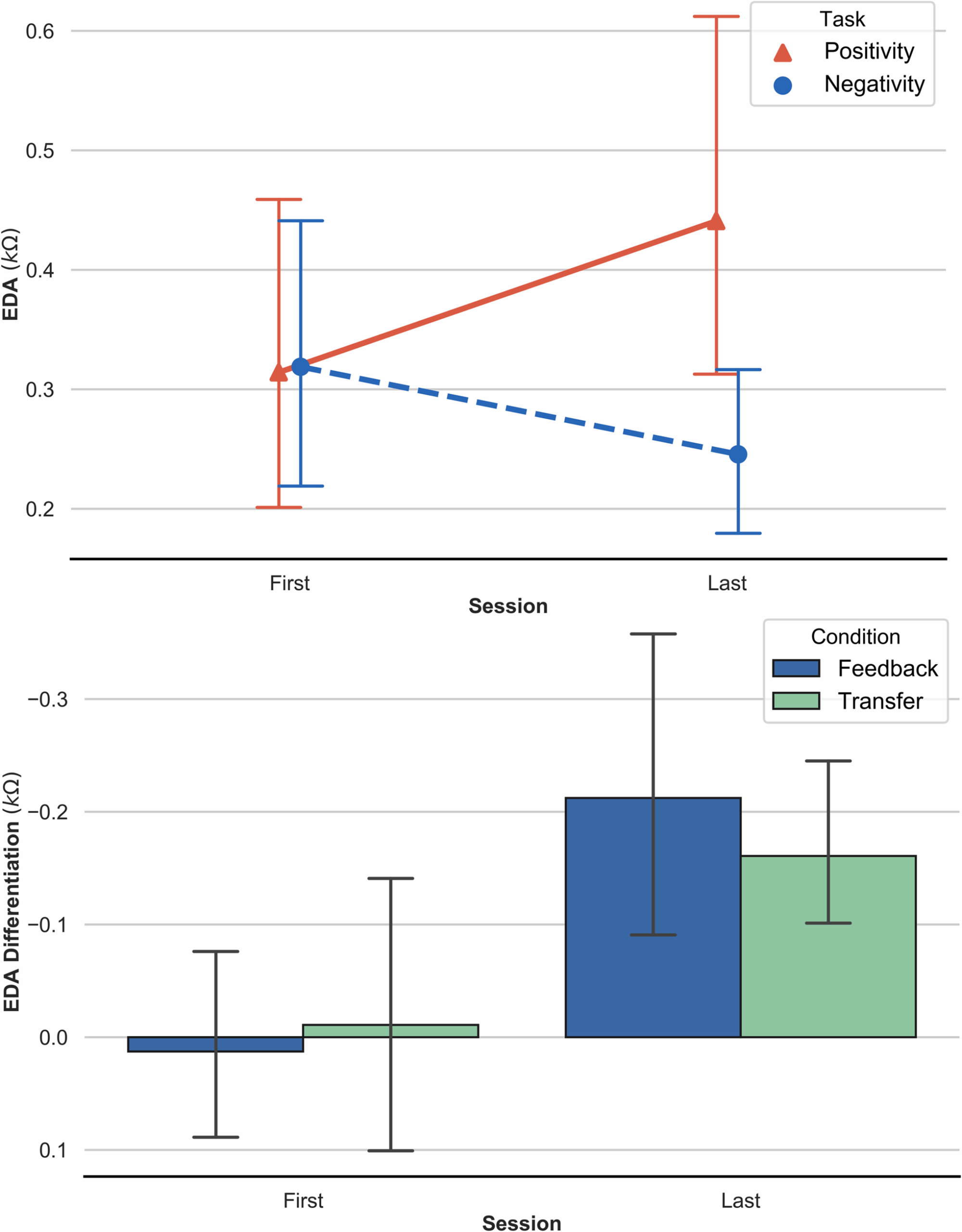 a. Time-Task-Interaction: Average electrodermal response e.g. electrodermal activity (EDA) over the first and the last six SCP-training sessions in the positivity task (red) and the negativity task (blue). b. Average electrodermal response e.g. electrodermal activity (EDA): EDA discrimination over the first and the last six SCP-training sessions. The figure shows the strength of the effect in the two different conditions (feedback vs. transfer).