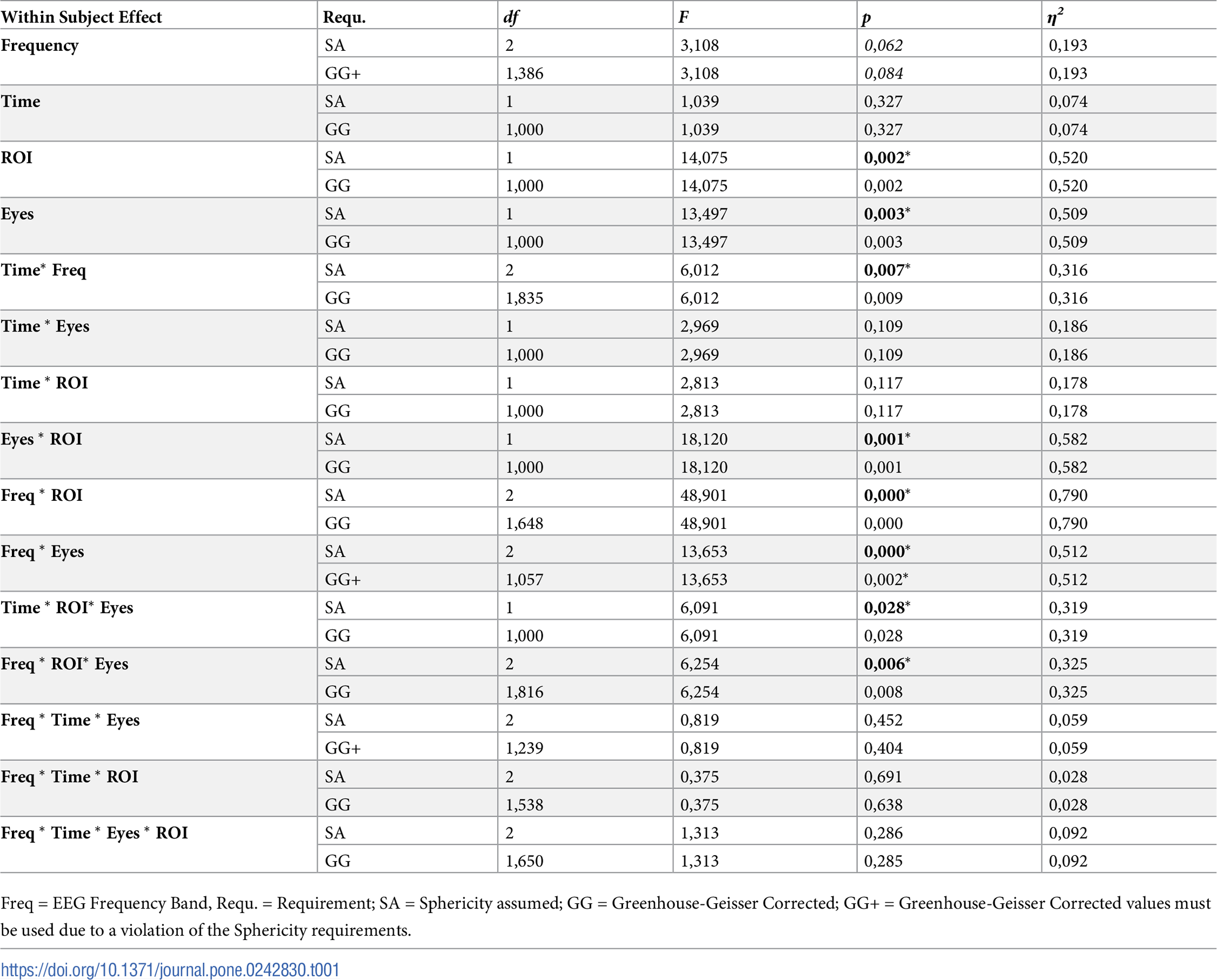 To detect changes in resting state EEG, an exploratory repeated ANOVA with factors “Time” (pre intervention/post intervention), “Region of interest” (ROI: midline/parietotemporal), “Frequency band” (delta/theta/alpha) and “Eyes” (EC: eyes closed/ EO: eyes open) was computed. Following ANOVA, post-hoc tests for particularly interesting differences were applied.